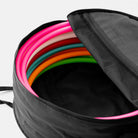 Bolsa de poliéster resistente para proteger los PERFECT HOOPS durante el transporte. La bolsa cuenta con dos asas y una correa acolchada para el hombro. En el interior hay un amplio bolsillo para accesorios y efectos personales. En el exterior hay un bolsillo con llavero. Tiene capacidad para hasta 6 PERFECT HOOPS de tubo de 20 mm de diámetro y 90 cm de diámetro exterior.