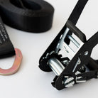 Carraca negra para cinta de 50mm con cinta negra y ranura de 1mt de longitud + cinta negra de 5m de longitud y gancho triangular de 50 mm cosido en un extremo