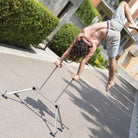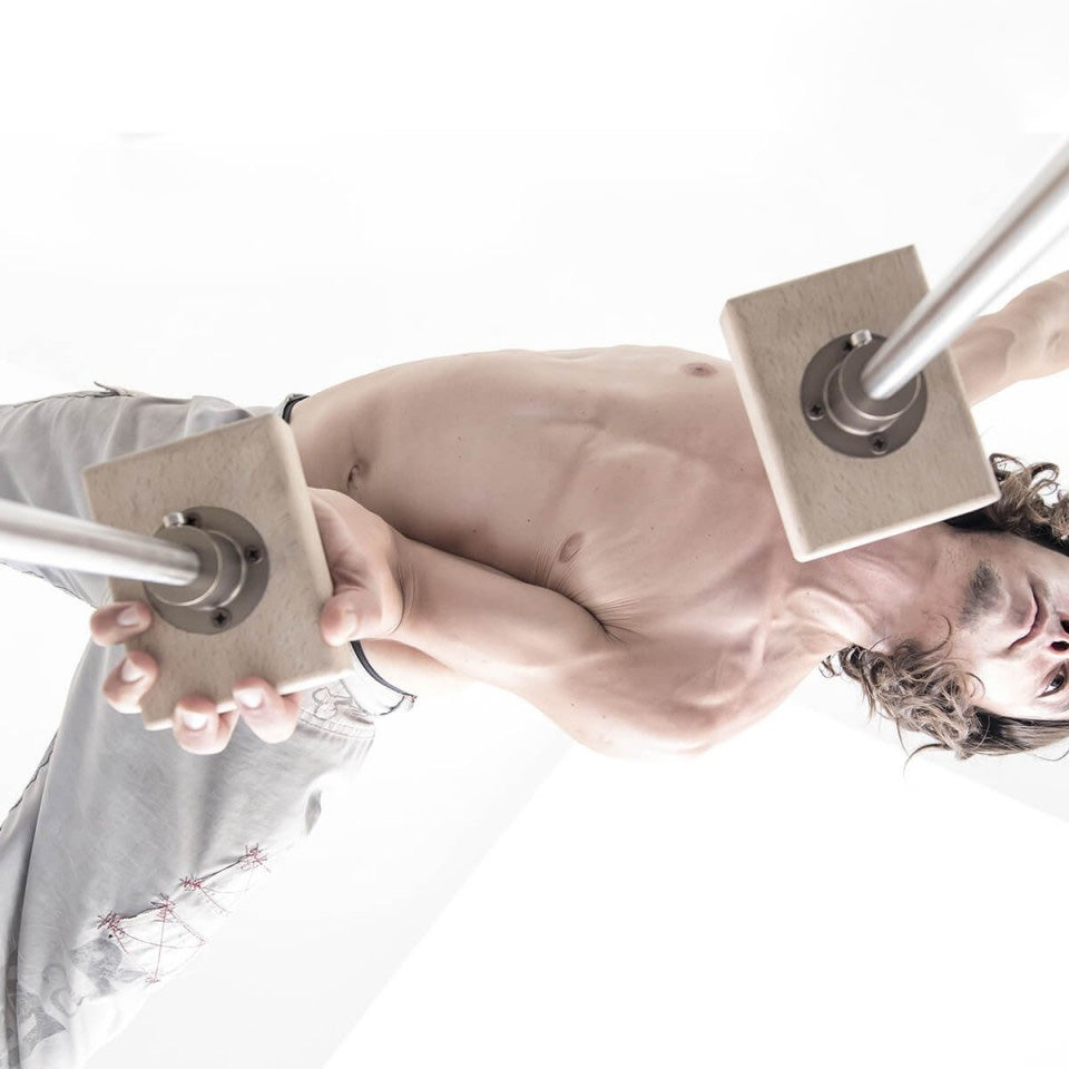 Los anchos de la caña de equilibrio de manos se pueden ajustar a 28 cm, 30cm, 32cm, 34cm, 36cm, 38cm y 40cm (11 pulgadas a 15.75 pulgadas). Estas configuraciones de ancho de hombros se adaptarán a la mayoría de los acróbatas. La altura total desde el suelo hasta la parte superior de los bloques de mano se puede ajustar entre 58 cm y 91cm (22-36 pulgadas) de altura.La altura de la plataforma se puede ajustar en incrementos de 3 cm. Toda la plataforma se puede desmontar y transportar en la bolsa de mano compartimentada para hacer el pino. El peso total es de 10 kilos (22 lbs.) con un tamaño de bolsa de 55 cm x 40 cm (22 pulgadas x 18 pulgadas). La plataforma para hacer el pino está hecha de aluminio anodizado con cañas de acero inoxidable y bloques de madera de playa. Los almohadillas niveladoras ajustables y antideslizantes te permiten nivelar el soporte, incluso en escenarios de teatro inclinados, así como en superficies irregulares al aire libre. La viga transversal de la plataforma tiene un nivel de burbuja incorporado, por lo que cada situación de configuración se puede nivelar fácilmente. Las cañas para hacer el pino son mucho más fáciles de equilibrar que hacer el pino en el suelo. Los bloques de mano te brindan un mejor control y agarre. También reducen la tensión en tus muñecas, ya que los bloques no requieren que tengas tanta flexibilidad en las muñecas. Usando las cañas para hacer el pino y los bloques de mano, puedes practicar durante más tiempo con menos fatiga corporal, así como reducir las posibilidades de lesiones en las muñecas.La altura ajustable también es una característica importante, ya que puedes establecer la altura de los bastones en proporción a tu estatura. Esta plataforma es, con mucho, la más versátil y de la más alta calidad en el mercado. El soporte está muy estilizado para el rendimiento, se ve fantástico en el escenario.