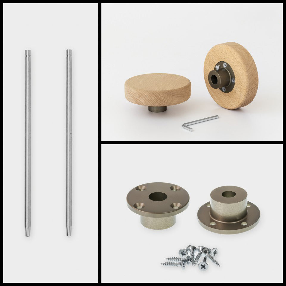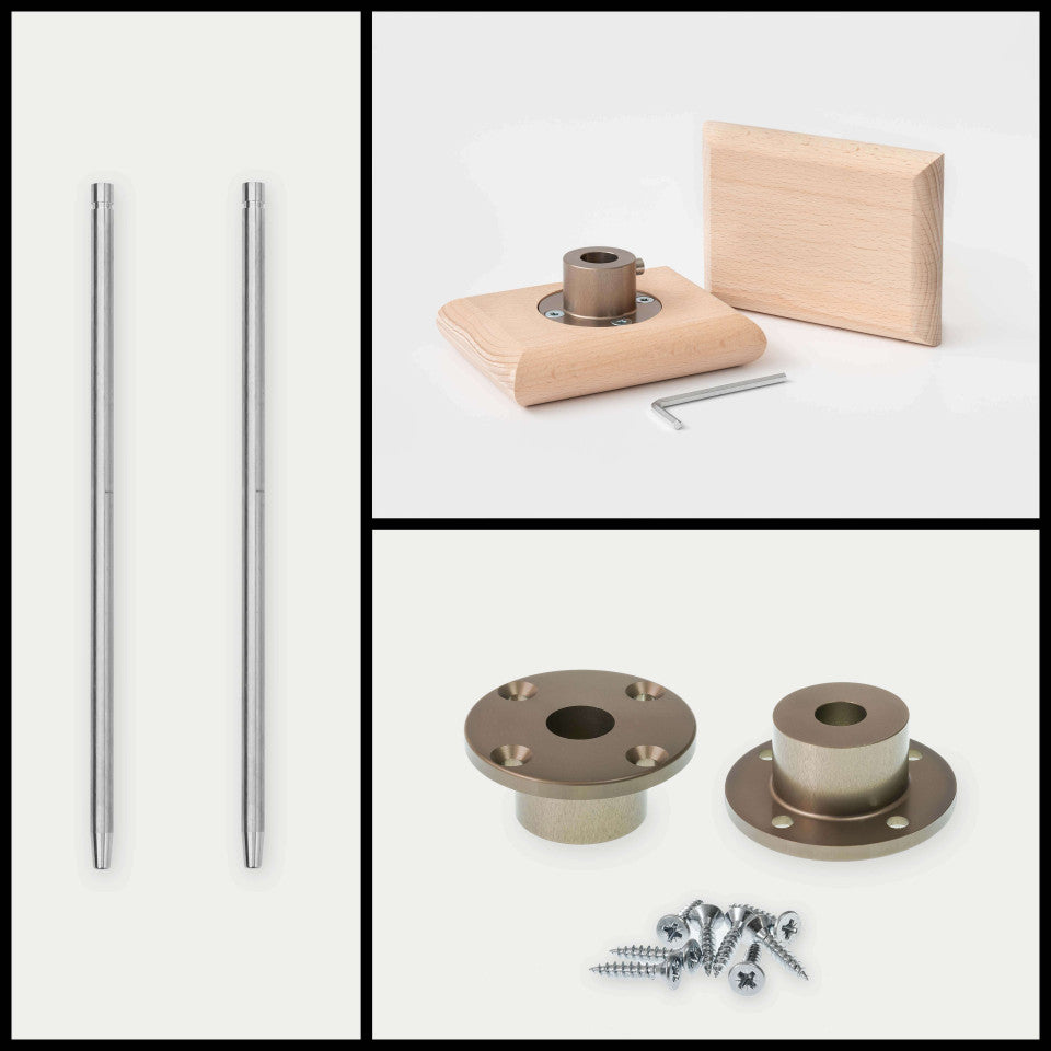 bridas, 2 tubos de 75 cm de longitud, 2 bloques, 8 tornillos y 1 llave Allen. Solo necesita hacer 2 agujeros de 35 mm para instalar las bridas donde desee.