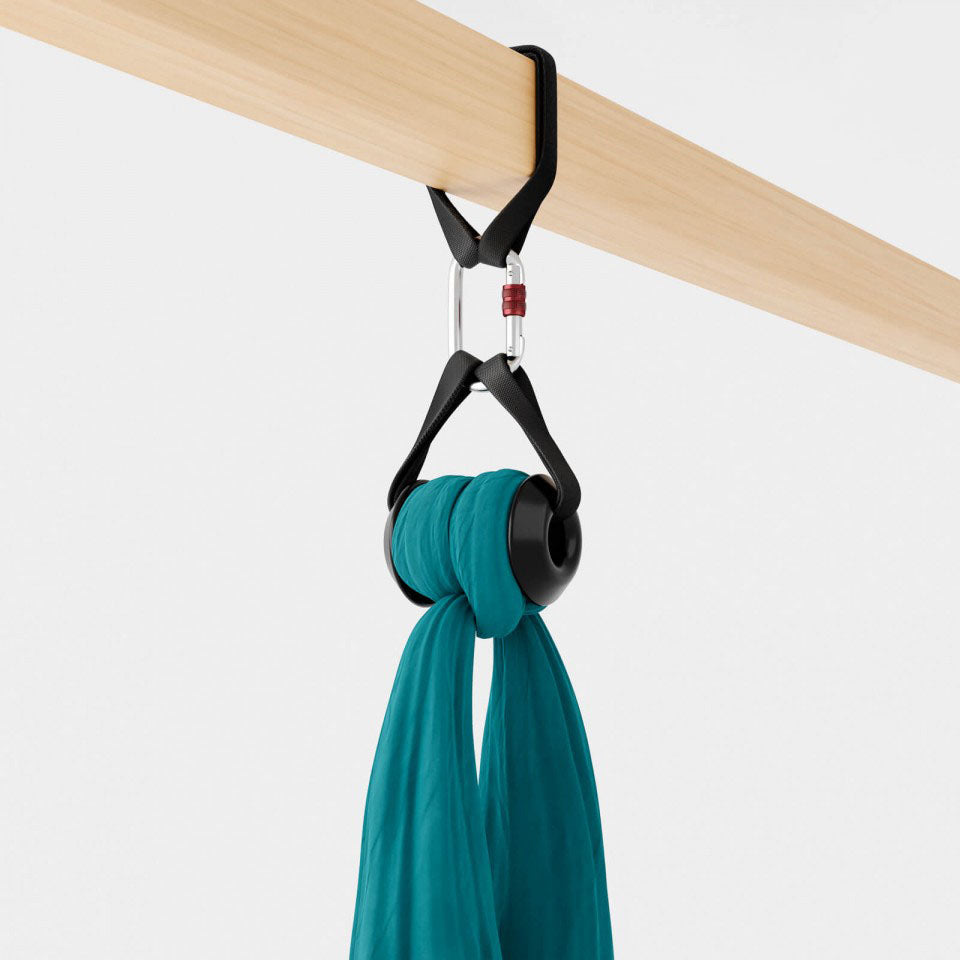 CONTENUTO KIT - tessuto aereo + gancio di ancoraggio + attacco trave (cinghia da 80 cm + moschettone auto-bloccante)
