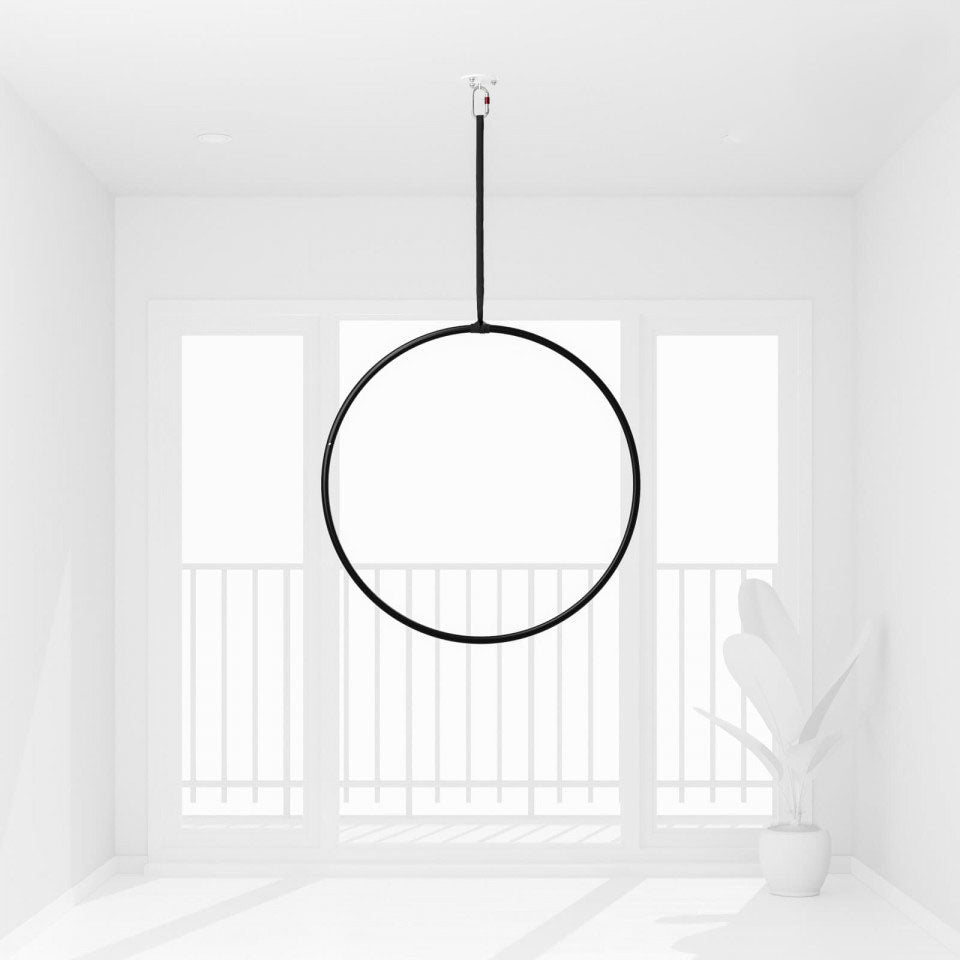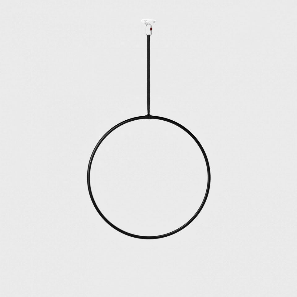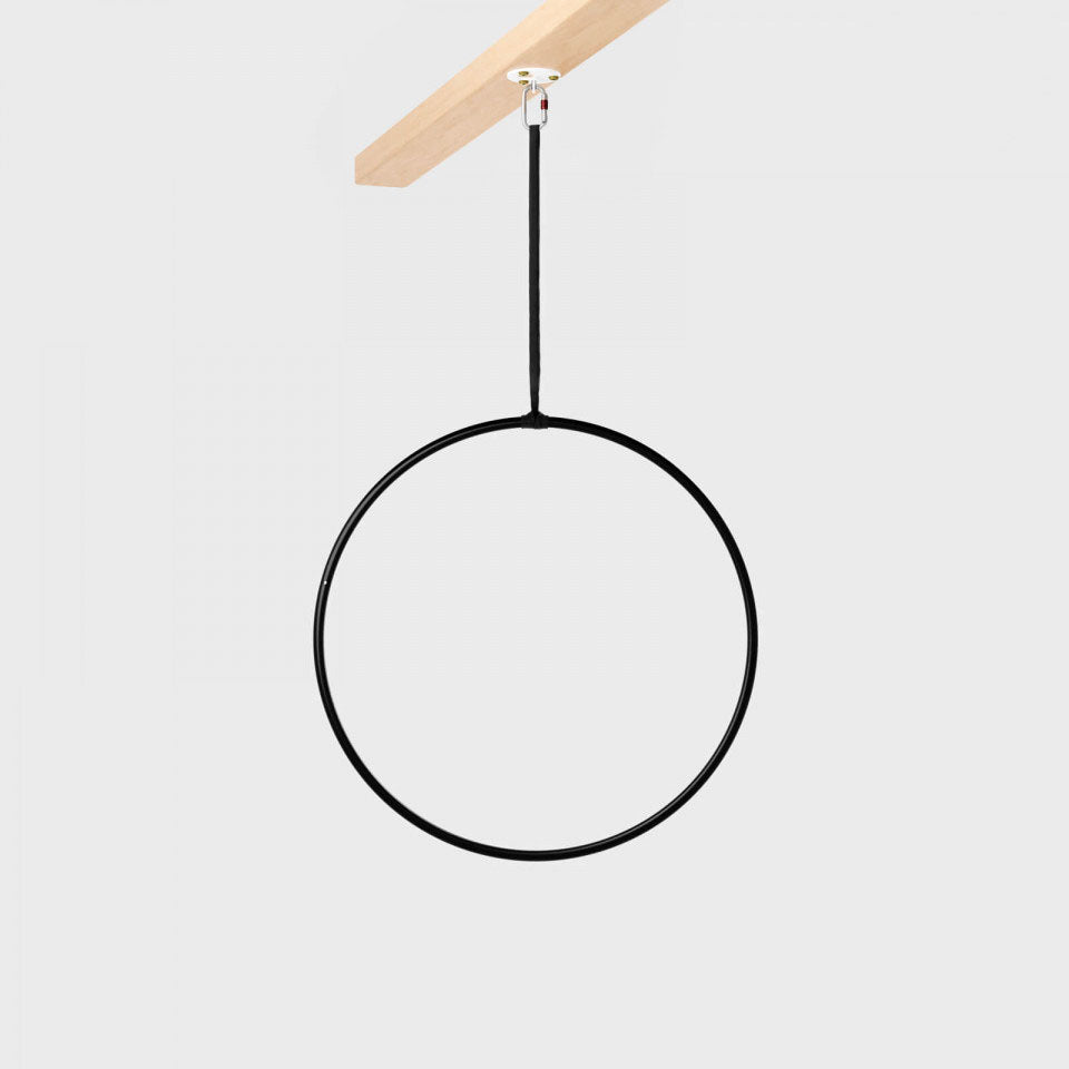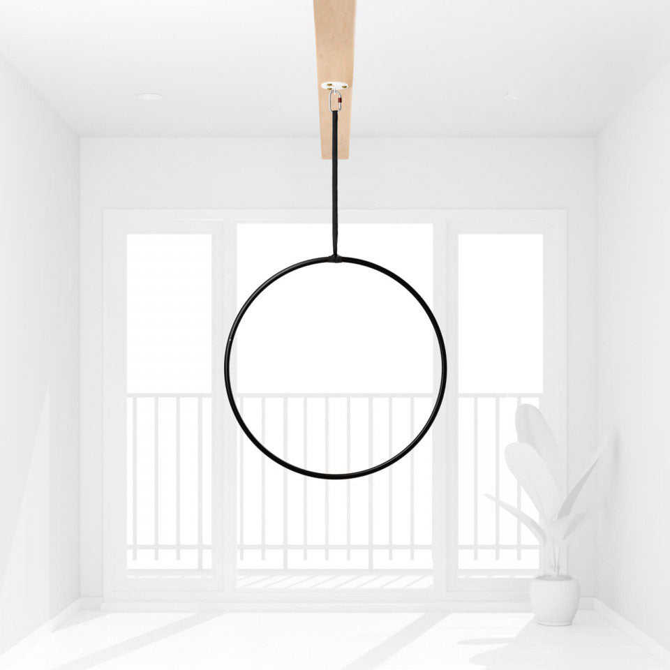 Aerial Hoop Kit, for creating a secure setup with wall mount, includes one ceiling: aerial hoop, lifting straps, ceiling plate, and Play Juggling carabiner. This aerial acrobatics kit is intended for professional use, but with proper installation, it can also be effectively used by amateurs and aerial enthusiasts. This kit includes an aerial hoop, a 75 cm double-sheathed reinforced polyester lifting strap (ideal for home installations with anchor points between 2.75 and 3 meters in height), a galvanized steel plate, and a carabiner.